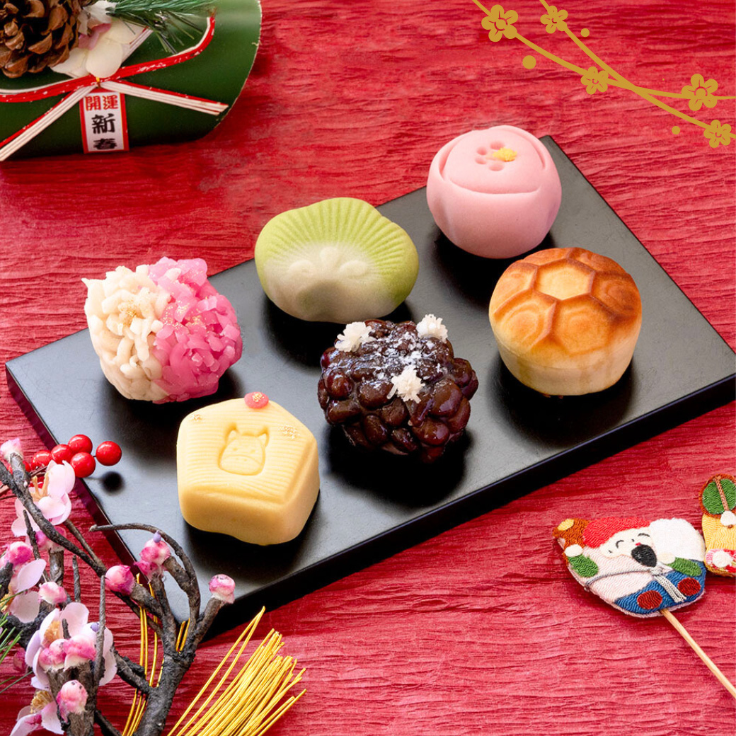 新春を彩る六種の上生菓子。 絵馬、梅、松、亀。縁起の良いモチーフを熟練職人が丁寧に仕上げました。 <