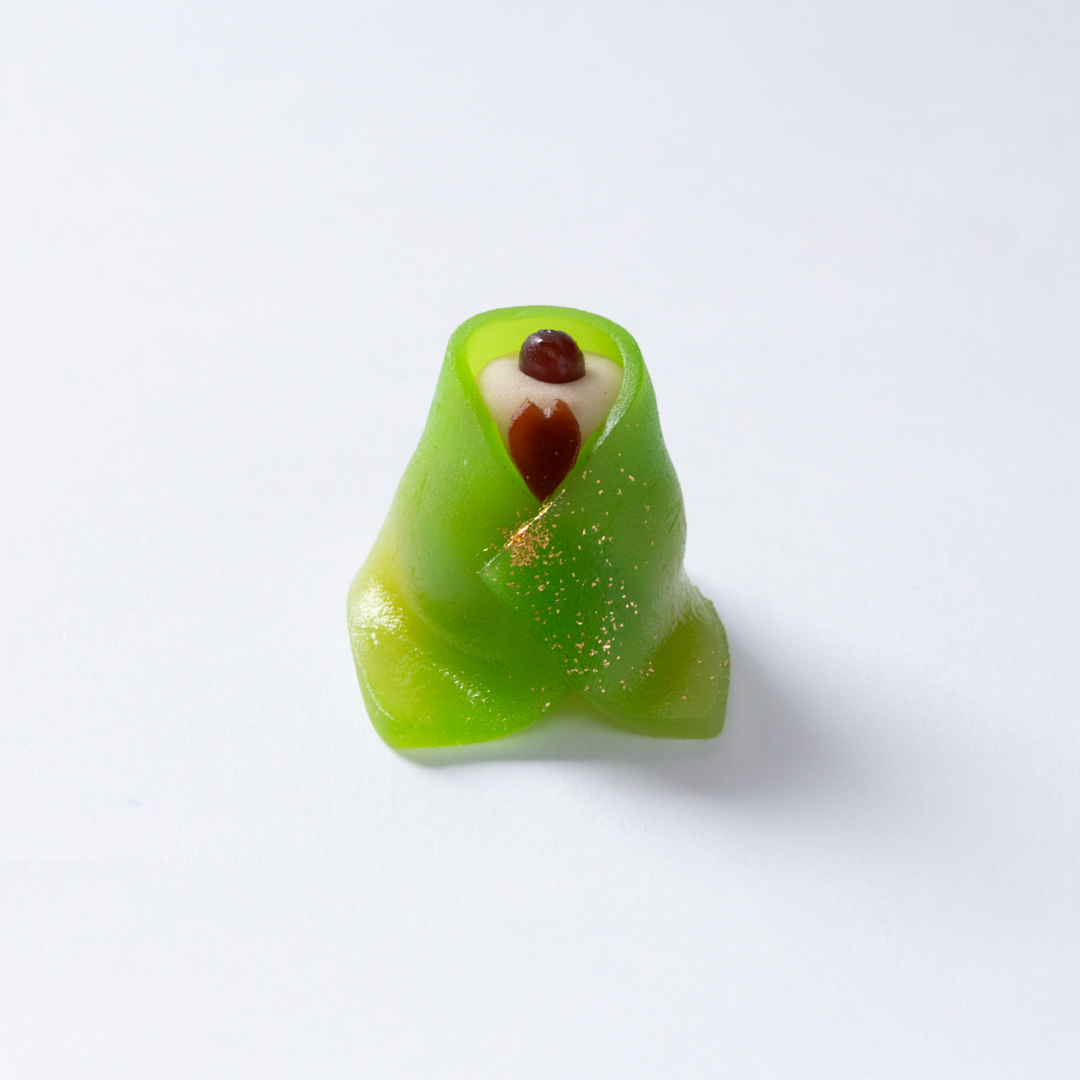可愛さから食べるのを少し躊躇するのですが、ひと口食べるとホッとする甘さが口いっぱいに広がります。主に使用している練りきりと小豆こしあん、羊羹はすべて自家製あん。最後に金箔で豪華に仕上げました。