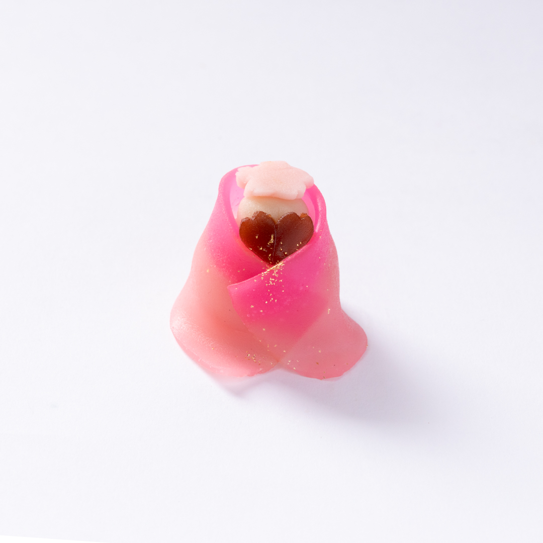 可愛さから食べるのを少し躊躇するのですが、ひと口食べるとホッとする甘さが口いっぱいに広がります。主に使用している練りきりと小豆こしあん、羊羹はすべて自家製あん。最後に金箔で豪華に仕上げました。