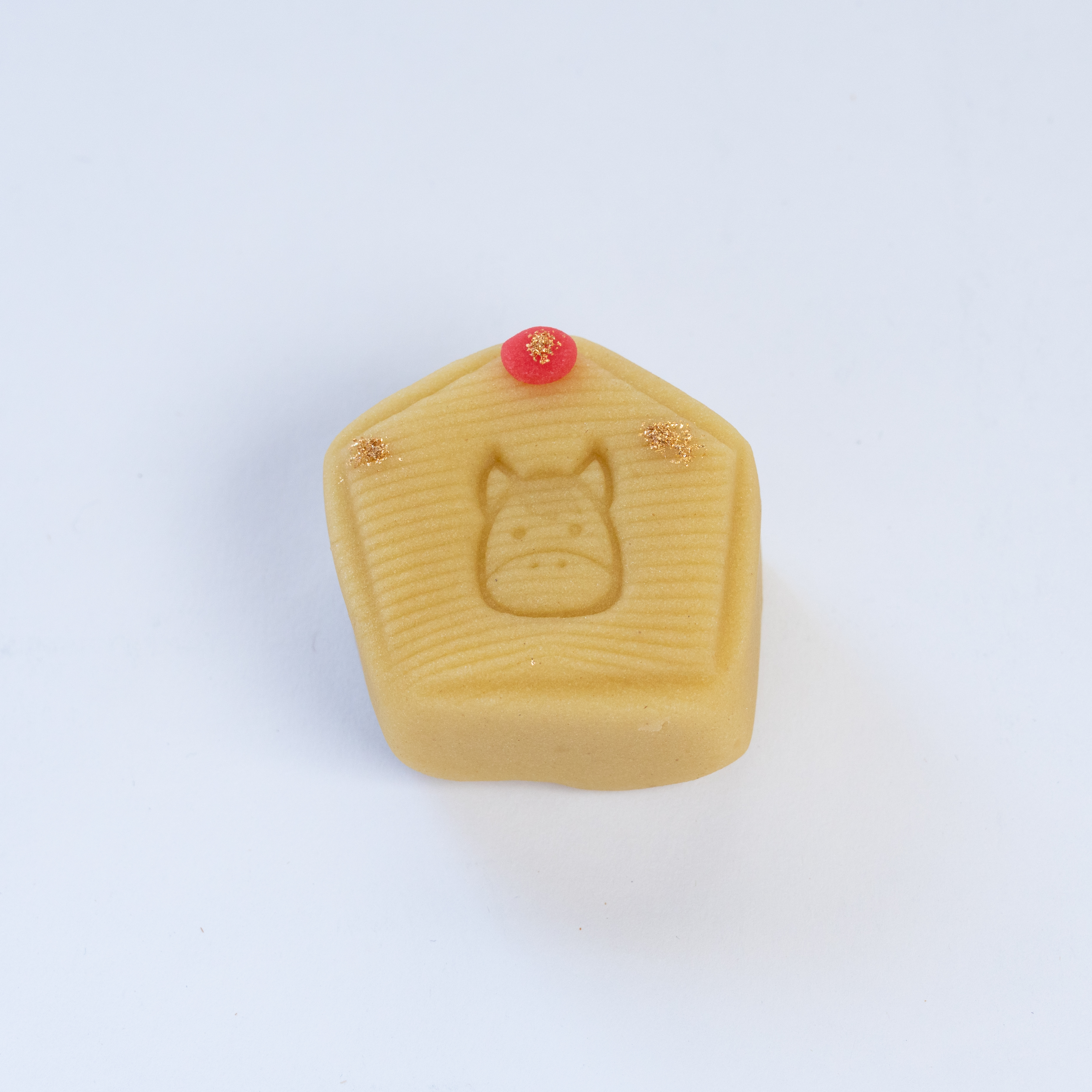新年の願いを込めた絵馬を、黄色の練り切りで表現しました。中には北海道十勝産小豆を使った自家製こしあん。なめらかな口あたりと優しい甘みが広がります。縁起の良い一品です。